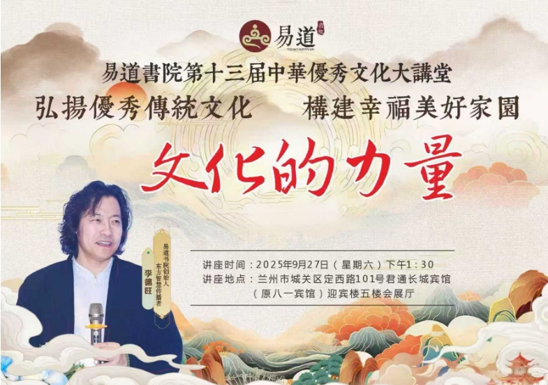 響應(yīng)時(shí)代號召,弘揚(yáng)傳統(tǒng)文化,旨在文化賦能行業(yè)發(fā)展,易道書院第十三屆中華優(yōu)秀文化大講堂將于9月27日在蘭州君通長城賓館(原八一賓館)迎賓樓五樓會展廳開講,誠邀有志之士共襄盛舉,學(xué)習(xí)傳統(tǒng)文化,賦能行業(yè)文明,構(gòu)建美好家園!