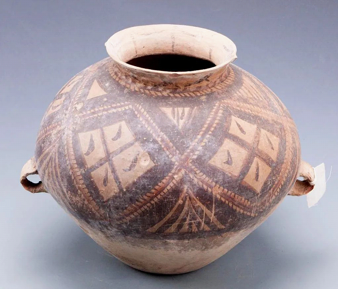 菱格紋是馬家窯文化半山類型彩陶的核心紋飾,由連續(xù)排列的菱形格構(gòu)成,常見于壺、罐等器物的上腹部。該紋飾流行于公元前2650-2350年的馬家窯文化中期,典型器型如甘肅省廣河縣半山遺址出土的菱格紋彩陶雙耳罐。早期以大面積菱格為主體,晚期演變?yōu)樘畛渚W(wǎng)格或涂黑的輔助紋飾,至馬廠時期發(fā)展為四大圓圈紋內(nèi)裝飾。