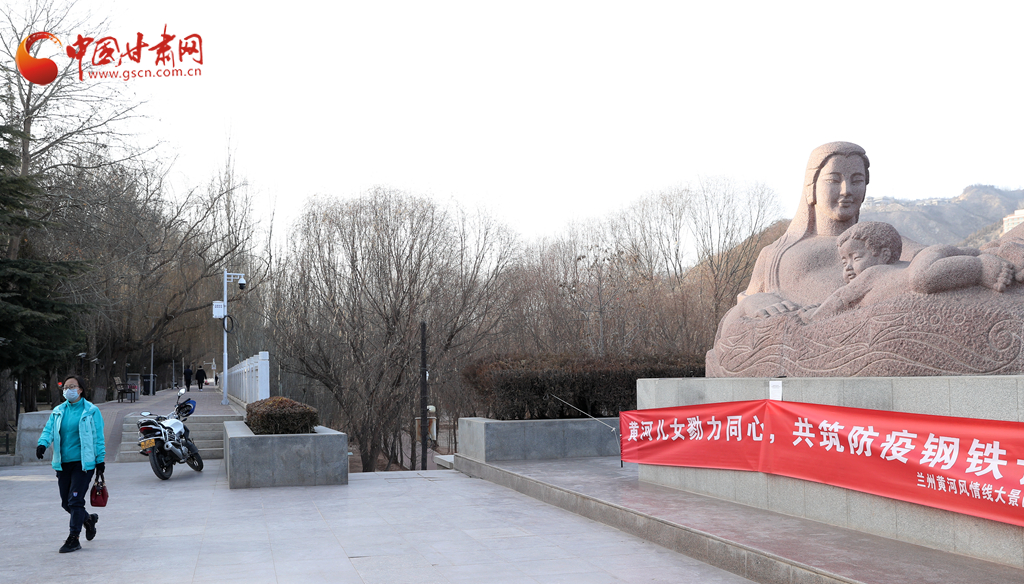同樣,代表蘭州城市形象的黃河母親雕塑,也拉起了一條紅色橫幅,上面寫(xiě)著“黃河兒女勠力同心,共筑防疫鋼鐵長(zhǎng)城。”