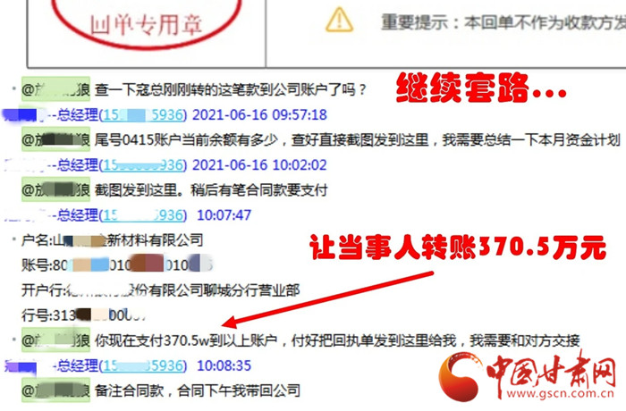 據(jù)了解,6月16日上午9時(shí)20分左右,安寧區(qū)某公司財(cái)務(wù)人員岳先生收到一封由“公司股東”發(fā)來的電子郵件,在郵件中推送了一個(gè)新建的QQ工作群,岳先生沒有多想就加入了此群。不久后,詐騙分子在此QQ群中冒充該公司法人和另外一名財(cái)務(wù)人員對(duì)岳先生下達(dá)指令,要求其向?qū)Ψ街付ㄣy行賬戶轉(zhuǎn)賬合同款370.5萬元。