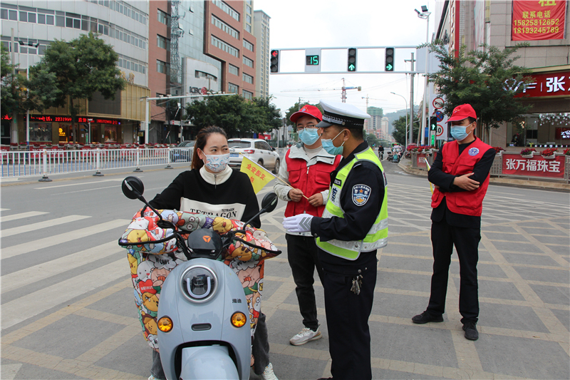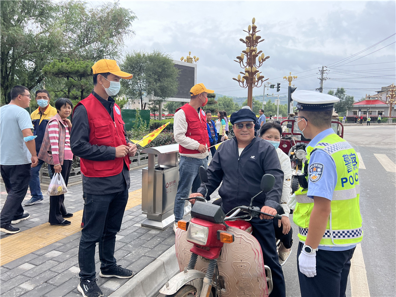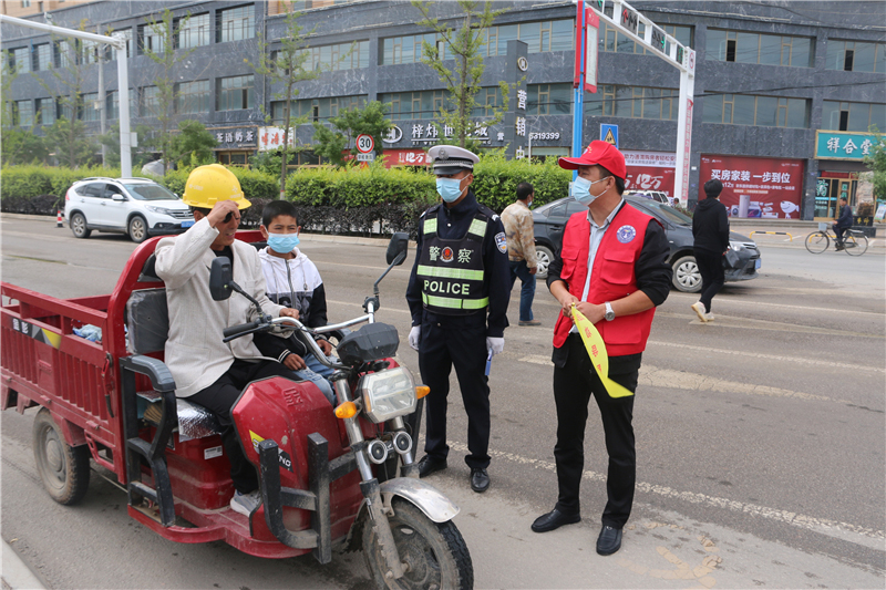 9月28日上午,參加“駕駛人學習教育體驗”活動的記滿分駕駛人正在甘肅定西岷縣小南門十字路口對不文明交通行為認真的進行著勸導。