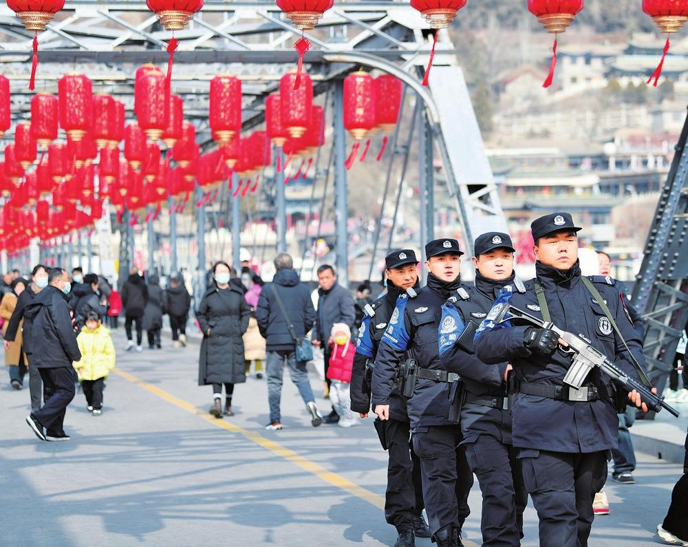 春節(jié)期間,蘭州市公安局城關(guān)分局中山橋警務(wù)站民警在中山橋巡邏,確保社會治安大局平穩(wěn)有序。新甘肅·甘肅法治報記者王輝攝