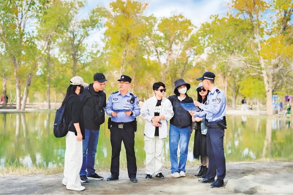 “壯美的胡楊,旖旎多姿的美景風(fēng)光,讓人不知不覺(jué)醉迷其中,景區(qū)隨處可見(jiàn)執(zhí)勤的民輔警,在這里旅游感覺(jué)安全感爆棚!”一位來(lái)自成都的游客鄧女士說(shuō)。