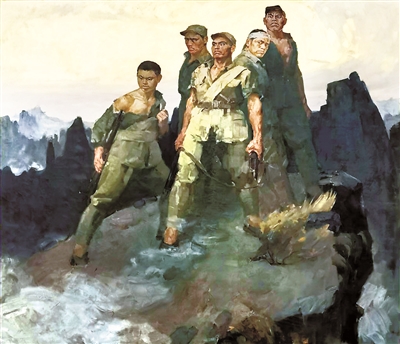 油畫《狼牙山五壯士》是畫家詹建俊為慶祝新中國成立十周年而作,描繪的是抗日戰(zhàn)爭時(shí)期五位八路軍戰(zhàn)士在寡不敵眾的情況下頑強(qiáng)戰(zhàn)斗,直到打光最后一顆子彈毅然砸槍跳崖的英勇場面。