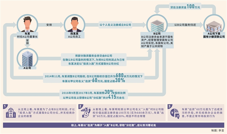 第二,車某的所謂出資行為并非市場投資行為,而是其利用職務(wù)便利獲取本屬于國有公司B公司的確定性預(yù)期收益的犯罪手段。本案中,車某明知其以甲公司名義“入股”時(shí),B公司實(shí)際資產(chǎn)高于注冊資金100萬元。經(jīng)查,在車某以甲公司名義“入股”B公司時(shí),B公司實(shí)際股權(quán)價(jià)值為680余萬元,車某“出資”60萬元占股30%,明顯不符合常理,換言之,車某“出資”60萬元不應(yīng)獲得30%股權(quán)。車某的真實(shí)目的是在不承擔(dān)市場風(fēng)險(xiǎn)的前提下,利用擔(dān)任A公司董事長的職務(wù)便利,將A公司確定能夠盈利的融資業(yè)務(wù)交給B公司經(jīng)營,并在確認(rèn)B公司能夠盈利的情況下,以“出資”為幌子“入股”B公司,獲取“分紅款”,應(yīng)以貪污罪論處。