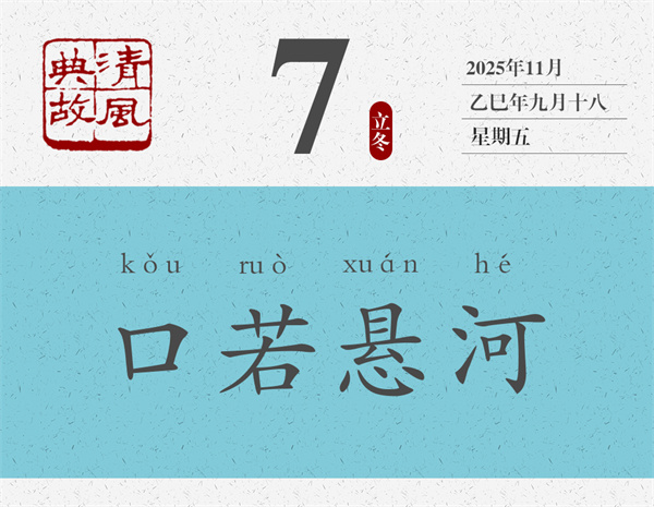 《世說新語》將王衍此語收入“賞譽”類,文字幾乎原文照抄了《晉書·郭象傳》里的話:“王太尉云:‘郭子玄語議如懸河寫(同“瀉”)水,注而不絕。”王太尉即王衍,郭子玄即郭象。“如懸河瀉水”是什么意思?一,有話可說,而且有說不完的話;二,口才非常好,凡是心里能想到的,嘴里都能說出來。三,說話很有氣勢,不哼哼哈哈,不磨磨嘰嘰,也不“這個這個”“那個那個”地沒完沒了。后世即以“口若懸河”為典,形容一個人表達能力超群,說起話來滔滔不絕。