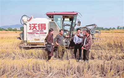 糧食安全是“國之大者”。安徽省含山縣紀(jì)委監(jiān)委聚焦高標(biāo)準(zhǔn)農(nóng)田建設(shè)管理中的突出問題開展一線走訪,推動(dòng)“糧田”變“良田”。圖為該縣紀(jì)檢監(jiān)察干部在環(huán)峰鎮(zhèn)城北村水稻收割現(xiàn)場(chǎng)了解相關(guān)情況。歐宗濤 攝