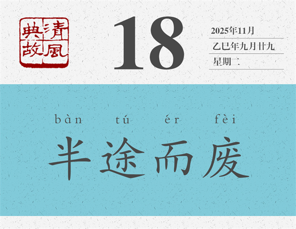 “半途而廢”語出《中庸》:“君子遵道而行,半途而廢,吾弗能已矣。”這句話是孔子說的:“君子遵循正道而行,但往往半途而廢,我絕不會(huì)停止的。”