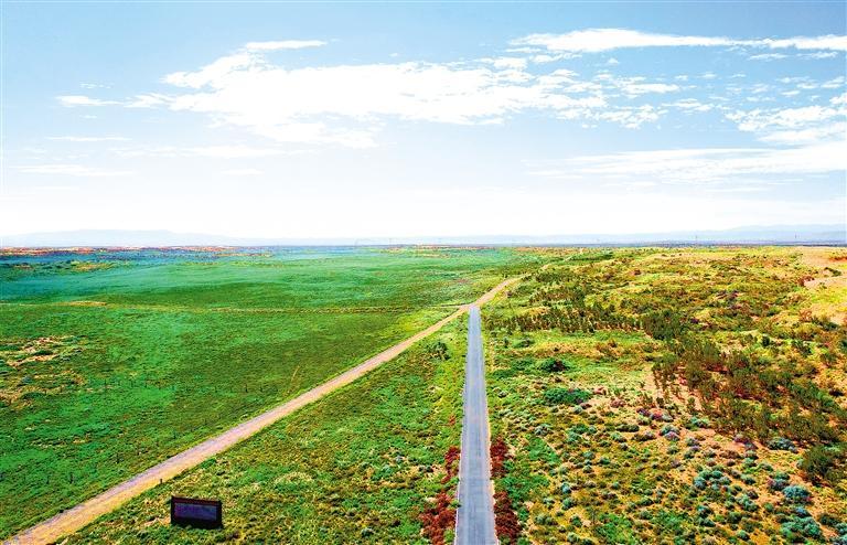 古浪縣北部沙區(qū)十二道溝附近,綠色在沙漠中延伸。新甘肅·甘肅日?qǐng)?bào)記者 金奉乾