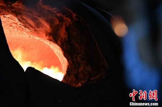 金川集團鎳冶煉廠閃速爐車間內(nèi),工作人員穿戴專業(yè)防護裝備觀察轉爐天然氣烤爐。