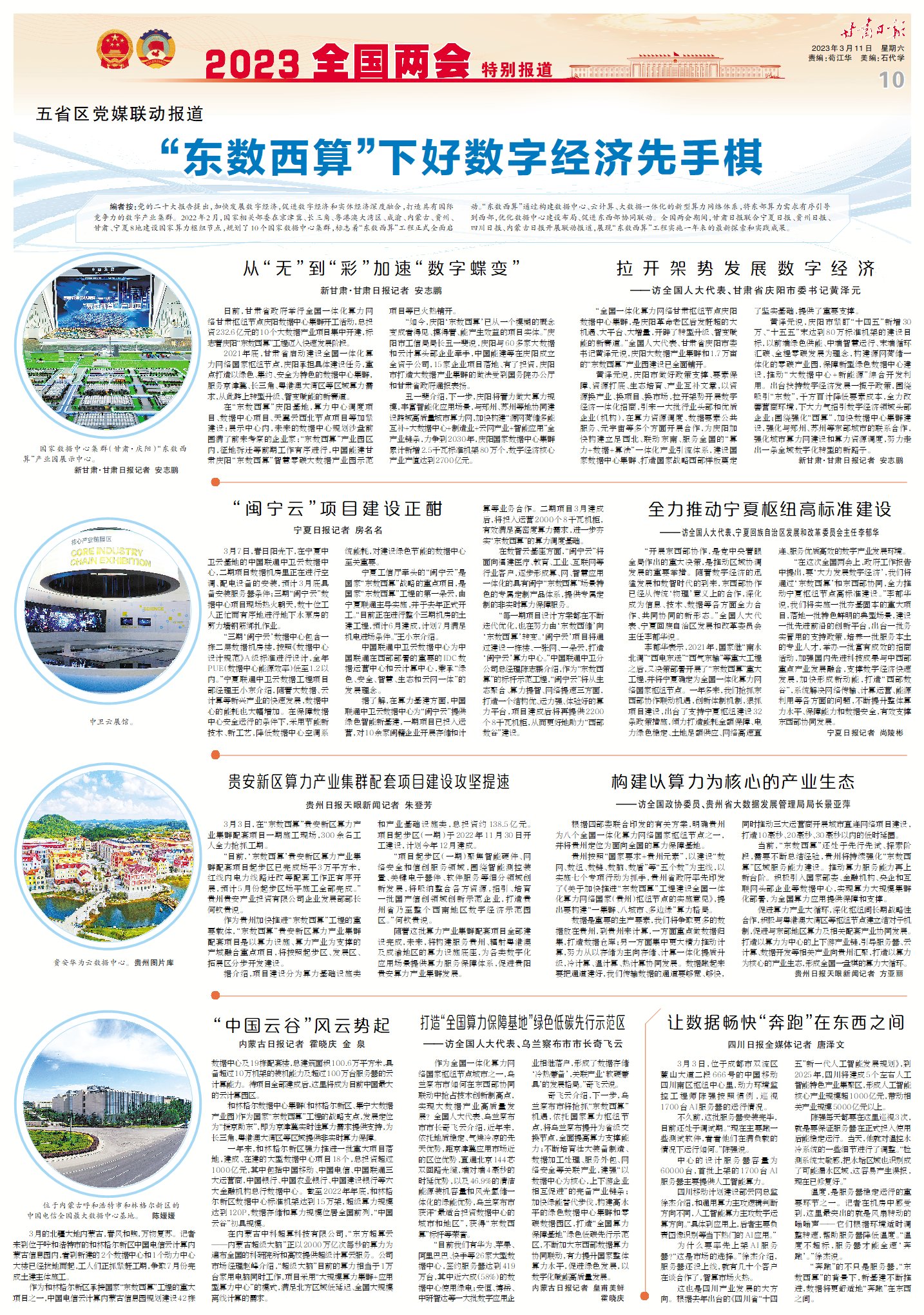 編者按:黨的二十大報(bào)告提出,加快發(fā)展數(shù)字經(jīng)濟(jì),促進(jìn)數(shù)字經(jīng)濟(jì)和實(shí)體經(jīng)濟(jì)深度融合,打造具有國(guó)際競(jìng)爭(zhēng)力的數(shù)字產(chǎn)業(yè)集群。2022年2月,國(guó)家相關(guān)部委在京津冀、長(zhǎng)三角、粵港澳大灣區(qū)、成渝、內(nèi)蒙古、貴州、甘肅、寧夏8地建設(shè)國(guó)家算力樞紐節(jié)點(diǎn),規(guī)劃了10個(gè)國(guó)家數(shù)據(jù)中心集群,標(biāo)志著“東數(shù)西算”工程正式全面啟動(dòng)。“東數(shù)西算”通過構(gòu)建數(shù)據(jù)中心、云計(jì)算、大數(shù)據(jù)一體化的新型算力網(wǎng)絡(luò)體系,將東部算力需求有序引導(dǎo)到西部,優(yōu)化數(shù)據(jù)中心建設(shè)布局、促進(jìn)東西部協(xié)同聯(lián)動(dòng)。全國(guó)兩會(huì)期間,甘肅日?qǐng)?bào)聯(lián)合寧夏日?qǐng)?bào)、貴州日?qǐng)?bào)、四川日?qǐng)?bào)、內(nèi)蒙古日?qǐng)?bào)開展聯(lián)動(dòng)報(bào)道,展現(xiàn)“東數(shù)西算”工程實(shí)施一年來的最新探索和實(shí)踐成果。