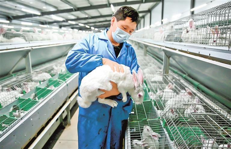 在武都區(qū)坪埡易地扶貧搬遷后續(xù)產(chǎn)業(yè)示范園里,康大肉兔養(yǎng)殖場的工人檢查肉兔生長情況