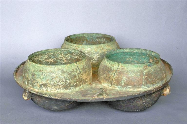 1979年,靈臺縣獨店鎮(zhèn)中慶村飲馬嘴漢墓出土了一件類似火鍋的連體三釜銅灶。通高16.4厘米,釜口徑分別為17厘米、17.4厘米、16.7厘米。三連釜,用九塊范鑄成。三釜均斂口,圓唇,球腹,圜底。圓盤窄沿,盤面近沿處分別置三個三角形掛鈕,盤下三釜外側(cè)各有一支釘,釜底有煙炱。從盤面間三系看,可供吊掛,盤陰三個支臺,可用于支撐,顯然有流動使用的功能。三個釜可同時烹煮不同食物,圓盤還可烘烤其他食品。老百姓俗稱三釜銅“火鍋”,但該銅灶是否為火鍋還需要進一步考證。