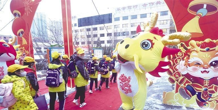 當(dāng)日上午7時(shí)許,記者在蘭州市東郊學(xué)??吹剑iT(mén)內(nèi)兩邊擺放著兩條由數(shù)百個(gè)氣球組成的長(zhǎng)龍。高年級(jí)段和低年級(jí)段的學(xué)生要穿越寫(xiě)著“龍騰虎躍,前程似錦”的龍門(mén),方可進(jìn)入教室。同時(shí),兩邊的老師,給每一位到校的學(xué)生發(fā)放小禮物。記者注意到,每個(gè)孩子都領(lǐng)到了一個(gè)小盲盒,里面裝著不同的文具。孩子們高興地?fù)]舞著手中的盲盒,展示新春的快樂(lè)。