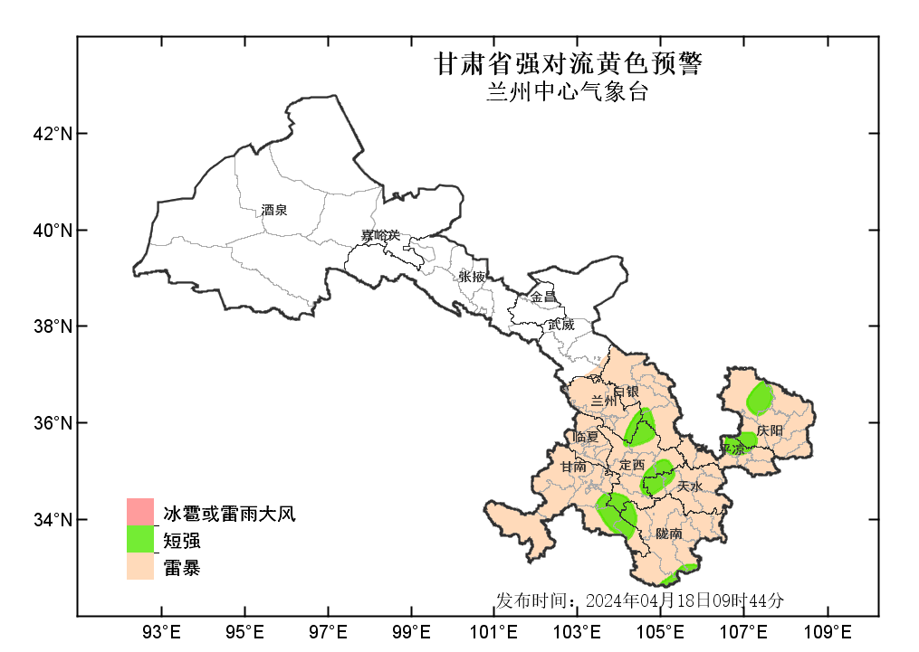 中國(guó)甘肅網(wǎng)4月18日訊(西北角·中國(guó)甘肅網(wǎng)記者 沈文剛)4月18日9時(shí)44分,蘭州中心氣象臺(tái)發(fā)布強(qiáng)對(duì)流黃色預(yù)警:預(yù)計(jì)今天白天到夜間,武威以東大部分地方有雷暴;其中,白銀、定西、甘南、天水等市州部分地方及蘭州、隴南、平?jīng)?、慶陽等市局部地方有雷雨大風(fēng)或冰雹;甘南、隴南、定西、天水、白銀、蘭州、平?jīng)?、慶陽等州市局部地方有短時(shí)強(qiáng)降水,最大小時(shí)雨強(qiáng)為20-30毫米。
