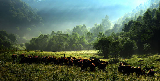 同樣是在天水市的張家川,關(guān)山,那列人文印痕飽滿的山脈像一條綠絲帶在我們面前展現(xiàn)著無(wú)盡的美麗,只是在張家川境內(nèi),它的旋律卻像是被擰緊的琴弦發(fā)出的,凝結(jié),突兀,而在相鄰的陜西省隴縣,它才盡情地展示著牧場(chǎng)的魅力,每一處峰巒山頂上還是一片林子,到了山腰卻變成了美麗的草甸,遍布牛馬。