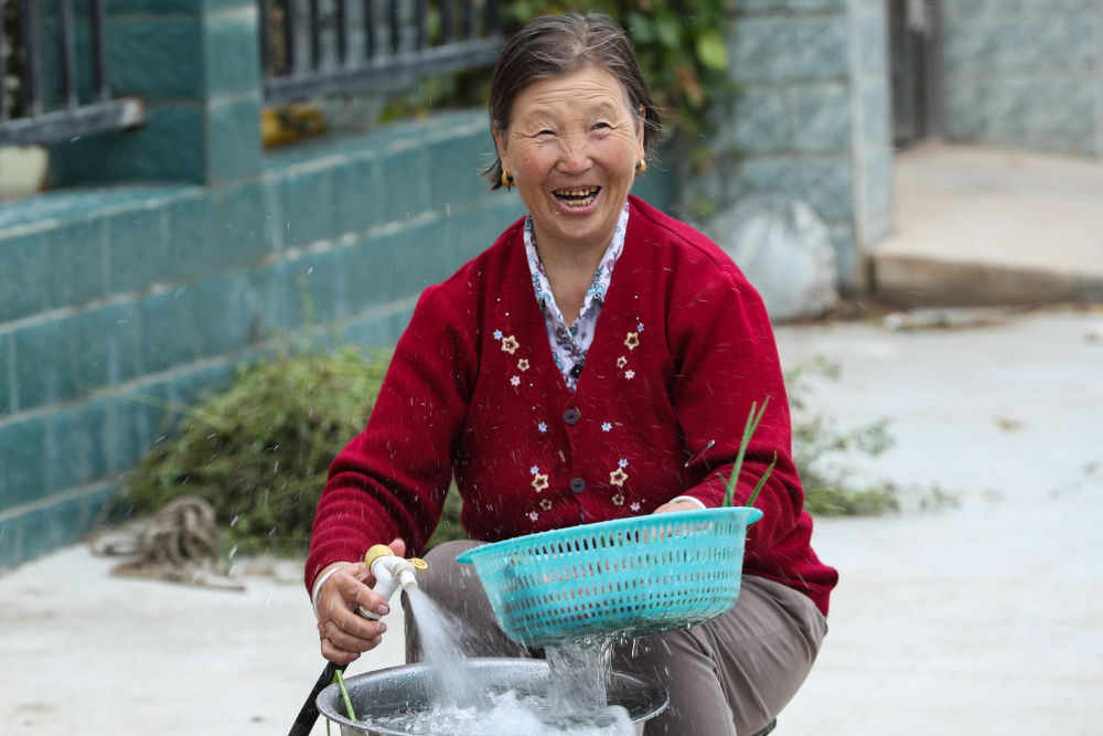 近日,在定西市隴西縣雙泉鎮(zhèn)癿羊口村,68歲的村民何淑蘭用引洮工程引來的自來水洗菜。新華社記者郎兵兵攝