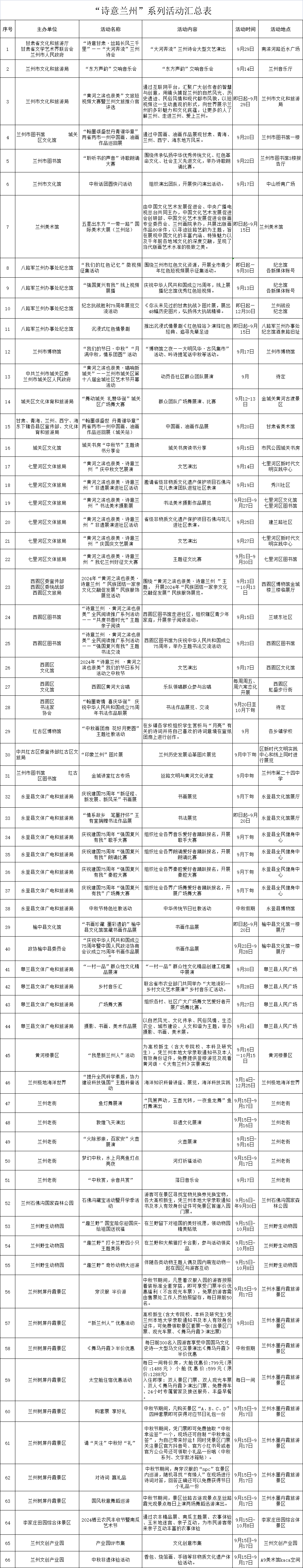 中國甘肅網(wǎng)9月14日訊(西北角·中國甘肅網(wǎng)記者 沈文剛)為預熱“大河奔流”蘭州詩會、豐富中秋假期文旅產(chǎn)品供給,蘭州市文旅局即日起至9月30日,推出“黃河之濱也很美·詩意蘭州”系列66項文旅活動,立足文化賦能旅游體驗,做優(yōu)產(chǎn)業(yè)、做實消費,為市民游客精心打造一場文旅服務盛宴。