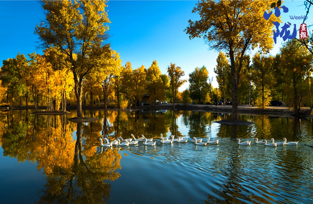 金色的胡楊倒映在蔚藍的水中,白鵝嬉戲,構成了一幅幅色彩對比強烈、視覺沖擊力極強的絕美畫面。