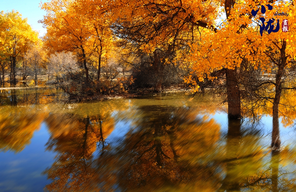 湛藍的天空、清澈的湖水、倒影的胡楊、金色的落葉,斑斕得如同油畫色彩。