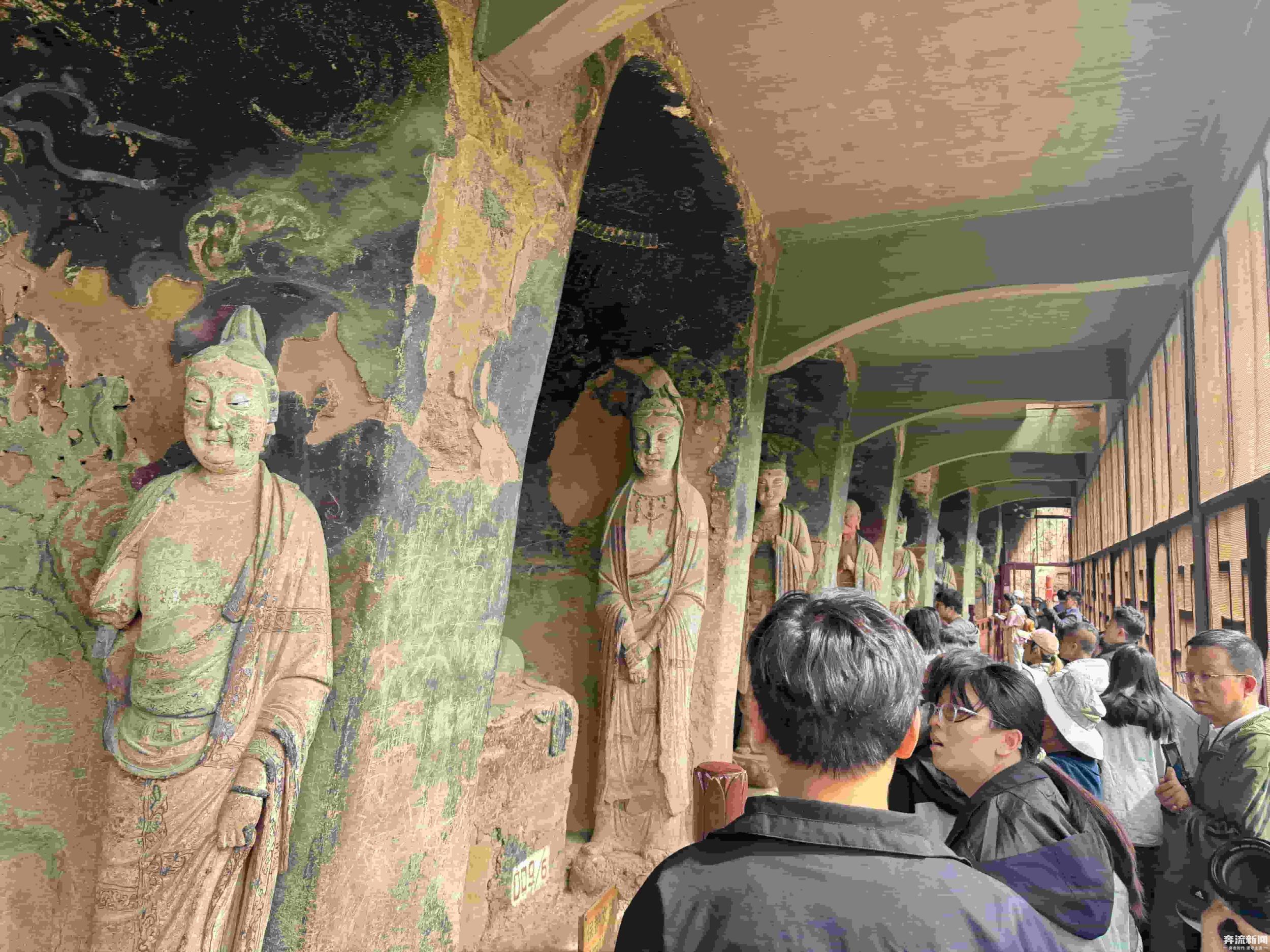 窟內(nèi)佛像造型各異,色彩鮮艷,既有莊嚴肅穆的佛祖、菩薩,也有生動活潑的弟子、天王。這些造像中,雖然有石雕和個別的木雕,但主要以泥塑為主,體現(xiàn)了多朝代中國佛教泥塑造像藝術(shù)的發(fā)展演變規(guī)律。奔流新聞記者了解到,在技法上,工匠們運用了圓雕、浮雕、鏤雕等多種技藝,使得佛像栩栩如生,富有強烈的立體感和動感。麥積山石窟也因為其獨特的“東方微笑”與精美的泥塑藝術(shù)聞名于世,被譽為“東方雕塑陳列館”。