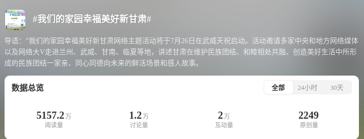 為深化互動引導,打造高流量IP,@甘肅網(wǎng)信、@快看甘肅等官方賬號發(fā)起社交平臺互動話題#我們的家園幸福美好新甘肅#。結合#厚道甘肅##萬千氣象看甘肅#等話題,@中新觀隴、@中國甘肅網(wǎng)、@甘肅好網(wǎng)民、@蘭州新區(qū)發(fā)布、@甘南融媒等賬號同步發(fā)力、同頻共振。目前,該話題總閱讀量超5530萬人次,討論互動量3.2萬人次。