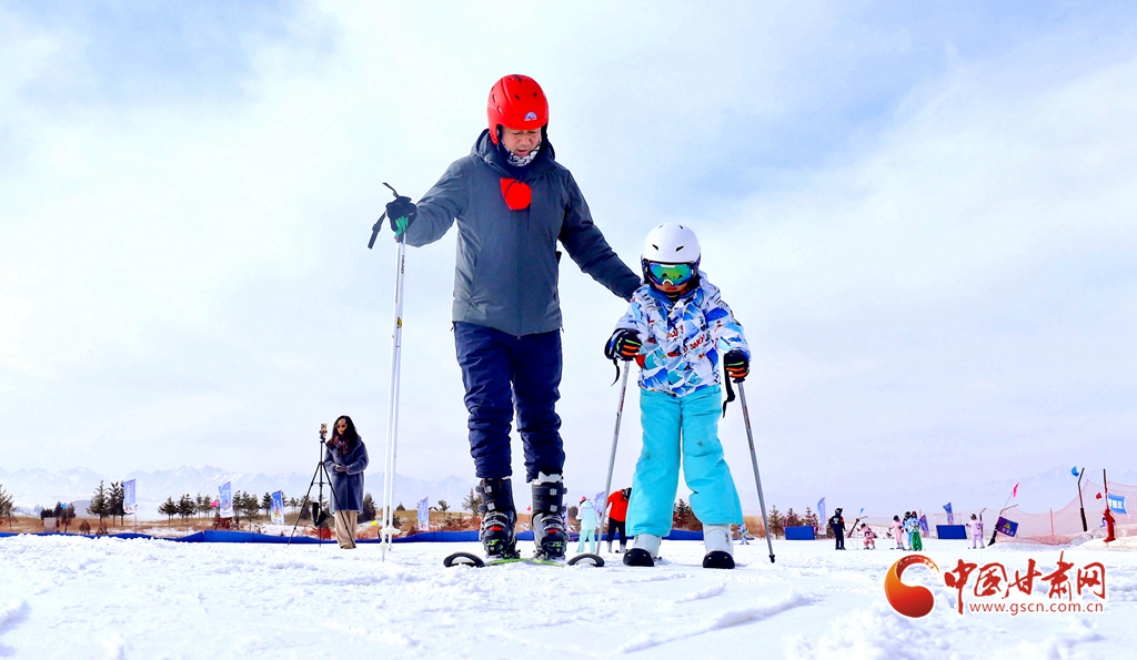 1月24日,在張掖肅南裕固族自治縣的康樂草原祁連山滑雪場,冰雪愛好者和游客攜孩子一同迎風馳雪,樂享冰雪運動的激情。他們在運動中強健體魄、磨煉意志,同時迎接即將到來的新春。