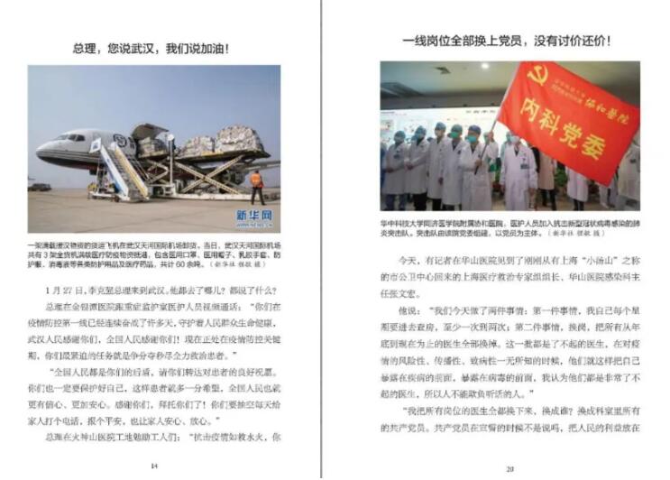 《2020:中國(guó)戰(zhàn)“疫”日志》一書(shū)以日志的形式,記錄了2020年1月23日到2月23日期間,中國(guó)每一天的戰(zhàn)“疫”故事:廣大醫(yī)護(hù)人員沒(méi)有遲疑、沒(méi)有退卻,和死神賽跑,與病毒抗?fàn)帲瑸樯恿?;?jiān)持工作的人民警察、外賣員、環(huán)衛(wèi)工人、快遞員、志愿者……穿梭在城市的每個(gè)角落,守護(hù)著自己的城市;許多媒體記者冒著被感染的風(fēng)險(xiǎn),深入一線采訪報(bào)道……