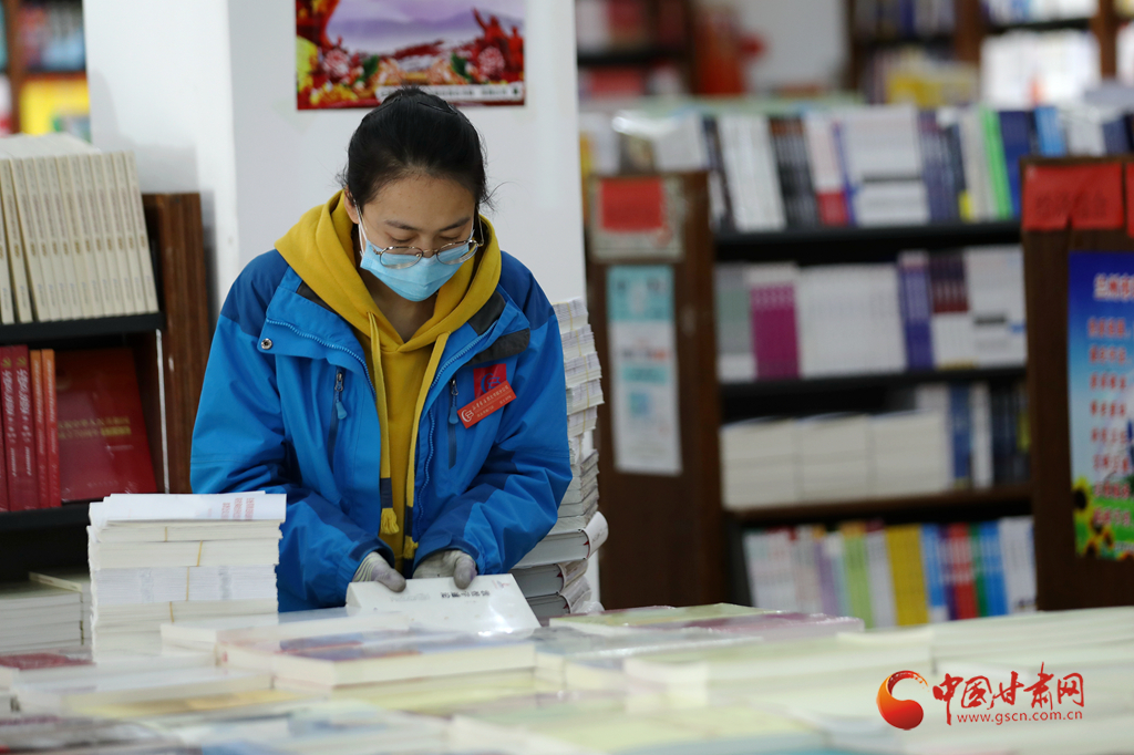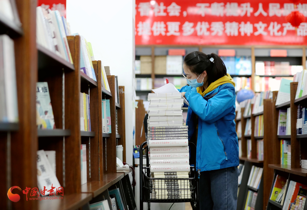 3月19日,在蘭州市西北書(shū)城,一名工作人員正在整理書(shū)籍。