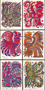 動物系列繪畫,從扎實而靈動的速寫與設計稿直至近似完美的正式作品,都蘊含了畫家捕捉物象的執(zhí)著與機敏,提煉造型的睿智與不懈,有了心血與摯愛的投入,那成竹在胸別具一格的小貓小狗小豬小鵝小猴也就躍然紙上呼之欲出了。在長方形的深色卡紙上,那銀色勾勒的活靈活現的百魚圖,讓我們沉醉于湛藍的海洋世界;在四方形的白色鏡框中,那七彩斑斕的百雞圖,讓我們迷戀于鄉(xiāng)間的濃郁風情;還有鞠躬盡瘁一生奉獻膂力雄強的牛群系列,馳騁千里挾帶雄風英姿勃勃的駿馬圖騰……