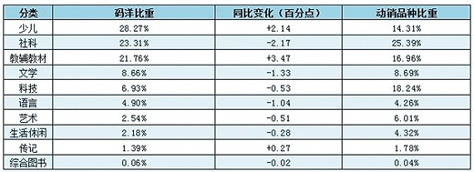 從細(xì)分市場(chǎng)情況來(lái)看,中小學(xué)幼兒園教材、法律、傳記、學(xué)術(shù)文化、教輔和少兒類呈現(xiàn)正向增長(zhǎng),其余類別均表現(xiàn)為同比負(fù)增長(zhǎng)。