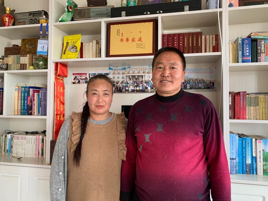 2020年12月10日,牧民敖特根達(dá)來(lái)和妻子在自家“書(shū)香家庭”獎(jiǎng)牌前合影。新華社記者 朱文哲 攝