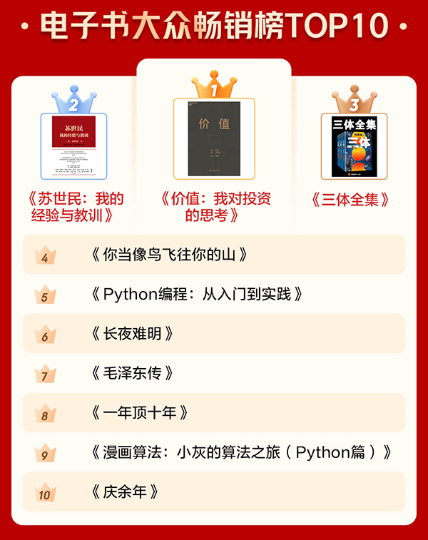 通過電子書暢銷榜TOP10和有聲暢銷榜TOP10可以看出,很多人愈發(fā)關(guān)注投資和管理等方面的內(nèi)容,也愈發(fā)注重個(gè)人學(xué)習(xí)?!秲r(jià)值:我對投資的思考》《蘇世民:我的經(jīng)驗(yàn)與教訓(xùn)》 分別位居電子書暢銷榜第一名和第二名?!吨袊?jīng)濟(jì)2020》《原則》進(jìn)入有聲暢銷榜前十。此外,學(xué)習(xí)類圖書《Python編程:從入門到實(shí)踐》《漫畫算法:小灰的算法之旅(Python篇)》也上榜電子書暢銷榜前十。