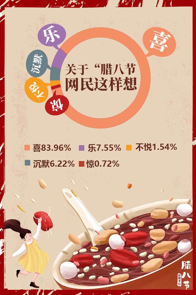 雖然今年多地的臘八節(jié)活動因疫情而取消,但是人們對于團(tuán)圓、祥和、富裕、康寧、平安的期盼從未改變。有關(guān)“臘八”的網(wǎng)民情緒分布中,“喜”占83.96%,“樂”占7.55%??傮w來說,開心喜悅的情緒占到了九成以上。
