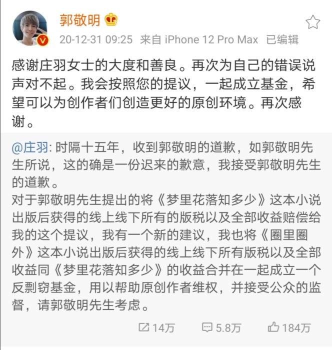 2020年12月31日,郭敬明通過微博就其小說《夢(mèng)里花落知多少》抄襲莊羽小說《圈里圈外》一事道歉:“時(shí)間過去了十五年,這個(gè)錯(cuò)誤一直伴隨著我,從我年少,到青年,到如今馬上走向四十歲的人生中點(diǎn)。”