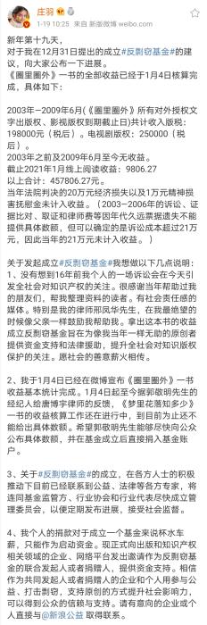 2021年1月19日,莊羽公布了“反剽竊基金”的最新進(jìn)展:《圈里圈外》一書的全部收益已經(jīng)于1月4日核算完成。