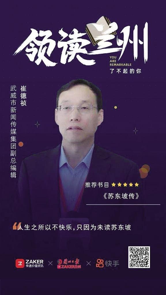 “領(lǐng)讀蘭州·了不起的你”大使薦讀進(jìn)行時(shí)……今天的薦讀大使是武威市新聞傳媒集團(tuán)副總編輯崔德禎,他最近正在讀的書是林語(yǔ)堂先生的《蘇東坡傳》,他向大家推薦這本書,希望跟大家一起閱讀!