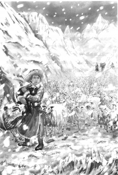 《金珠瑪米小扎西》插圖,小扎西在山間牧羊。何毅畫(huà)
