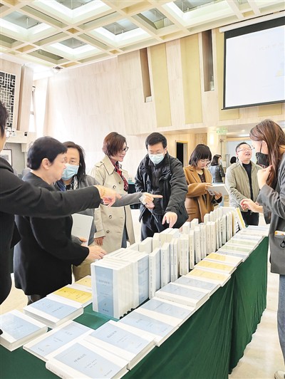 中場休息,與會專家學者圍著叢書第一輯熱烈交談。