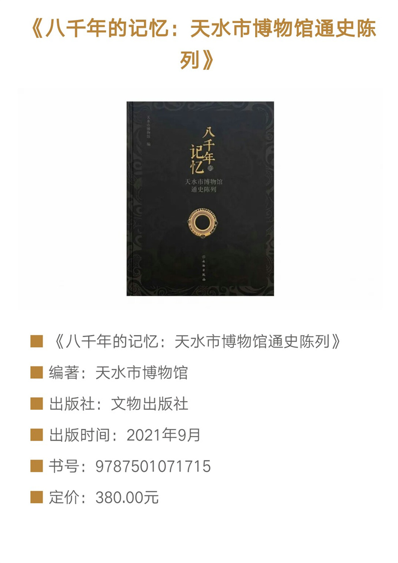 《八千年的記憶——天水市博物館通史陳列》圖錄,是在2018年天水市博物館通史陳列展覽提升改造基礎(chǔ)上提煉而成,以天水市博物館能夠反映天水歷史文化面貌的館藏精品文物為重點(diǎn),輔之以天水地區(qū)出土的藏于其他文物機(jī)構(gòu)的重點(diǎn)文物,旨在展示天水八千年歷史文脈和文明成就。全書共分為文明曙光、嬴秦故園、兩漢物華、魏蜀兵戈、渭水梵音、隋唐盛景、茶馬大市、古城遺韻8個(gè)部分,擷集天水文物精粹,在展現(xiàn)天水自舊石器時(shí)代至明清時(shí)期完整歷史序列的同時(shí),突出了獨(dú)具天水特色的歷史文化資源。