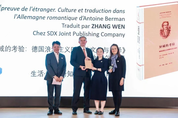 法國駐華大使羅梁(左二)為社科類獲獎譯者頒獎。法國駐上??傤I事館供圖