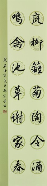 庭柳籬菊陶令酒,鳴禽池草謝家春。 釋文:庭前柳樹(shù),籬邊菊花,陶淵明飲酒于此,怡然自得;池塘里長(zhǎng)滿(mǎn)了春草,樹(shù)上的鳴鳥(niǎo)冬去春來(lái),謝靈運(yùn)因此寫(xiě)出了這樣的千載名句。韓宗岳(滿(mǎn)族)