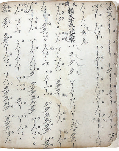 二是音位型曲譜,以各類符號指代樂器上的音位。使用這類曲譜,必須首先明確弦樂器的定弦、定品方式,管樂器的開孔標準和按孔、吹奏方法,才能確定每個音位的實際音高。正因如此,音位譜往往與樂曲宮調密切相關。同一份譜子,換用不同宮調演奏,音響大不相同。20世紀初,敦煌藏經(jīng)洞曾發(fā)現(xiàn)一份五代時期的曲譜,采用20個琵琶音位符號記錄,是目前已知這類曲譜的早期代表。