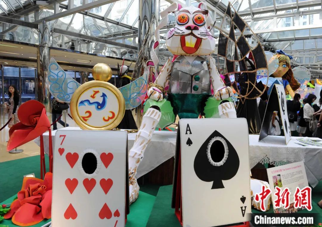 以西方著名兒童文學作品《愛麗絲夢游仙境》為藍本創(chuàng)作了巨型木偶及巡游藝術品在香港太古城中心亮相。中新社記者 任海霞 攝
