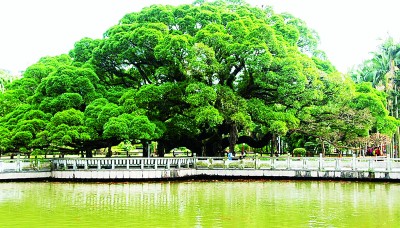 擁有古樹的城市就是擁有歷史的城市。福州古榕遍布,四季常青,是城市、市民生活與樹木的完美結(jié)合,是風景的自然生長,是歷史根深葉茂地屹立。福州古榕以樹齡長、歷史久、數(shù)量眾而著稱。見證福州城市史的,當首推鼓山國家森林公園、八一水庫旁,福州無人不知的已近千歲,被譽為福州榕樹王的古榕。相傳,這棵古榕是張伯玉所栽植的兩棵樹苖,光陰荏苒,同氣相求,如今兩棵榕樹相互糾結(jié)、勾連、纏繞、親密,已無分彼此。其冠幅達1300米,可容納千人在樹下談古論今,聊天遮陰。遠望,似綠色陵巖;近看,知其為榕也,密密的枝葉把近午的陽光切割成碎花點,散落、閃亮在榕樹下的草坪和地衣上。初訪者或為訝異:偌大一棵古榕卻不見氣根,知榕者會告訴你,這是一株碩大、古老而不生氣根的細葉榕。因其冠幅日益長大,為了支撐沉重的樹冠、預防主干折損,便制作了若干石柱,砥柱其間。古榕下有湖塘,錦鯉游泳,不時生出紅色漣漪。旁有一碑,上刻:榕蔭照水波心漾,觀魚猶勝花間行。