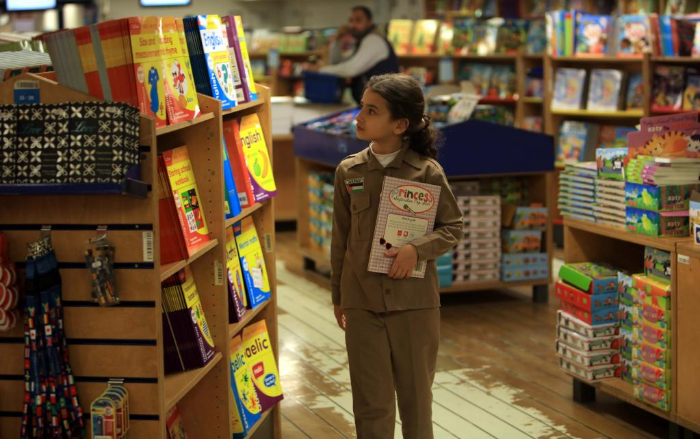2月13日,在約旦亞喀巴港,一名女孩在“望道號(hào)”上挑選書籍。