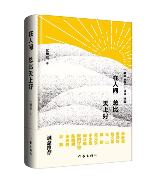 近日,江耀進(jìn)詩選《在人間總比天上好》由作家出版社出版。詩選共收入作者近三年來創(chuàng)作的247首詩歌作品,分為六集,即:“山河歲月”“生命瞬間”“塵世片斷”“城市鏡像”“日常觀照”和“感恩親人”。