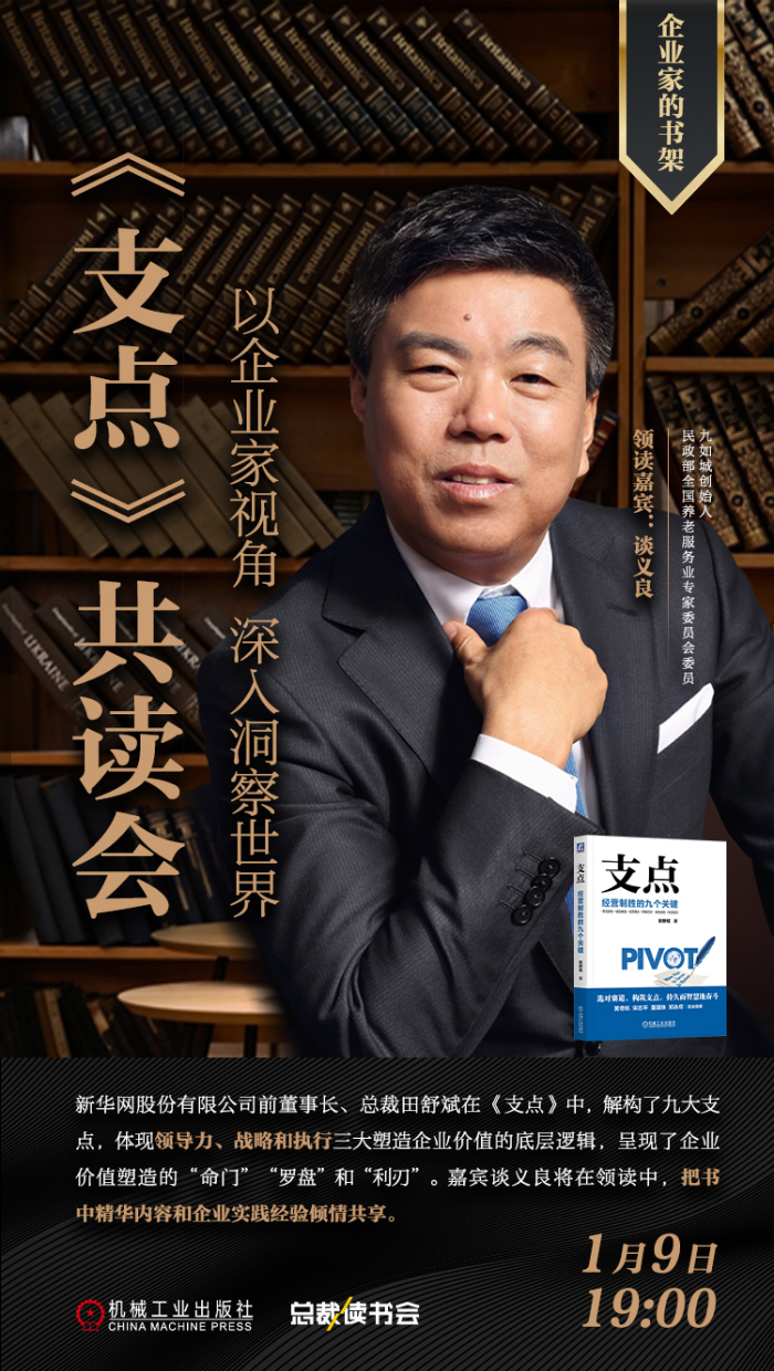 為了企業(yè)家更好地塑造企業(yè)價值,提升格局和眼界,1月9日19:00九如城創(chuàng)始人談義良將領(lǐng)讀《支點》一書,將在“認識管理”視頻號上進行直播。通過如何從多維度視角塑造企業(yè)價值、如何提升企業(yè)家的格局和眼界、如何做好團隊塑造,構(gòu)筑人力資本基石三個方面,從企業(yè)家視角把書中精華內(nèi)容和企業(yè)實踐經(jīng)驗傾情共享,千萬別錯過。