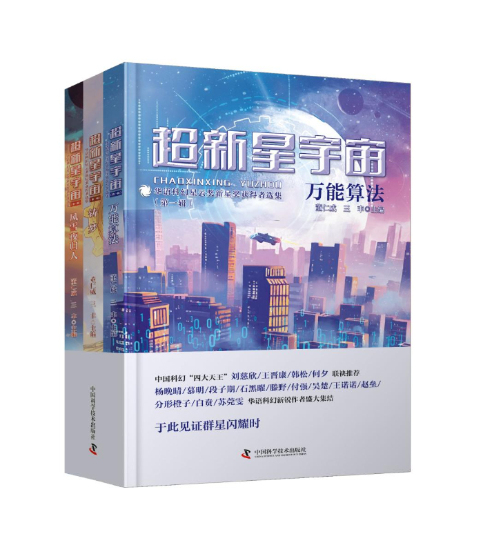 《超新星宇宙》由著名科普科幻作家董仁威、著名科幻學者三豐主編,第一輯分為《萬能算法》《鑄夢》《風雪夜歸人》共三冊,收錄了榮獲第十、十一、十二屆華語科幻星云獎2016-2020年度新星獎獲得者楊晚晴、慕明、段子期、石黑曜、滕野、付強、吳楚、王諾諾、趙壘、分形橙子、白賁、蘇莞雯等12名新銳作者的18篇作品。