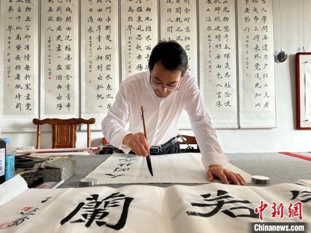8月26日,甘肅通渭悅心國際書畫村,書法家在工作室創(chuàng)作。閆姣 攝